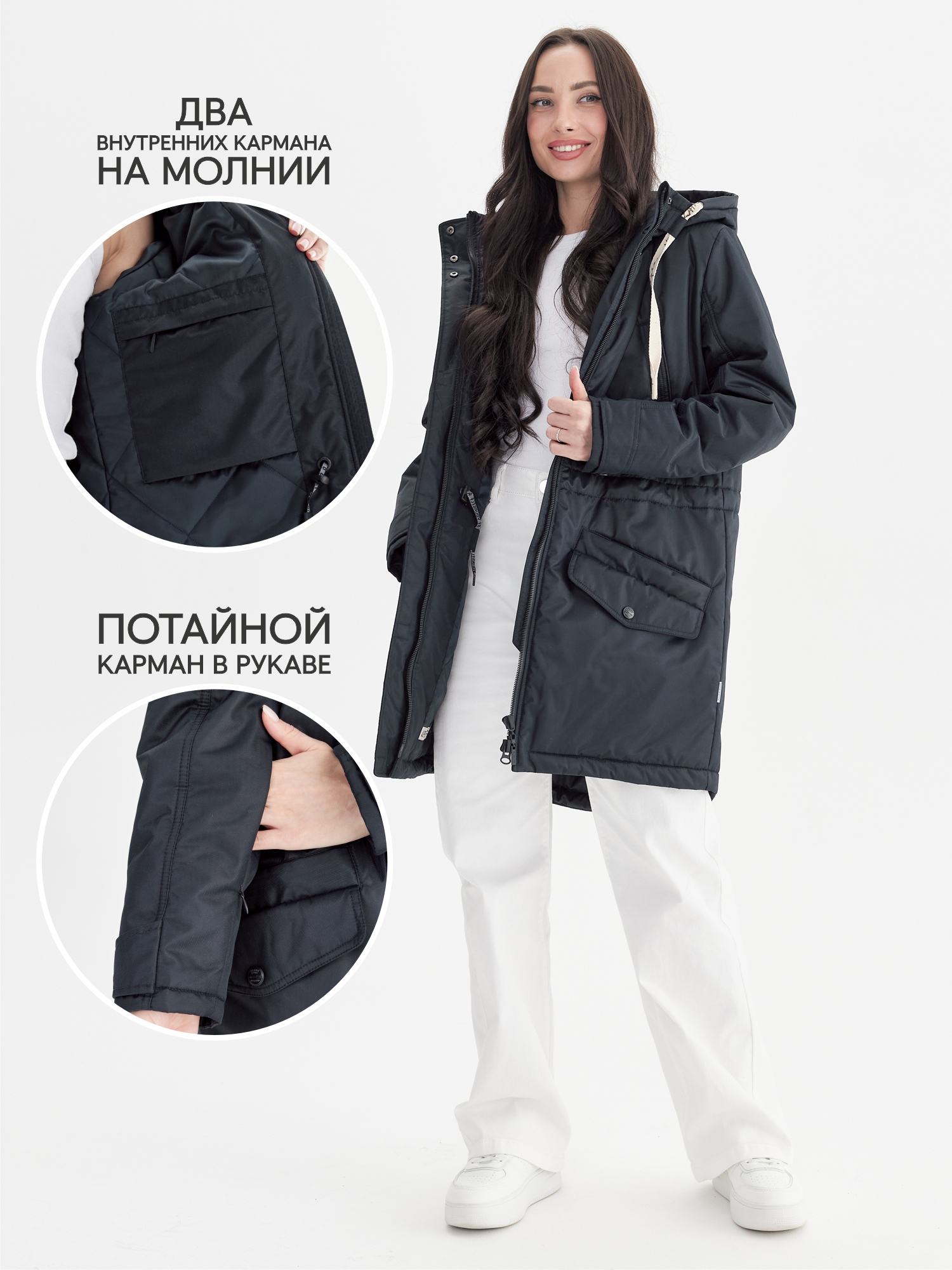 - Четырехкарманная система: 2 боковых прорезных кармана с клапаном на магнитах, 2 нагрудных прорезных кармана с листочкой на кнопке, 1 секретный карман на рукаве с молнией для карты, На подкладке левой полочки накладной карман на "молнии".