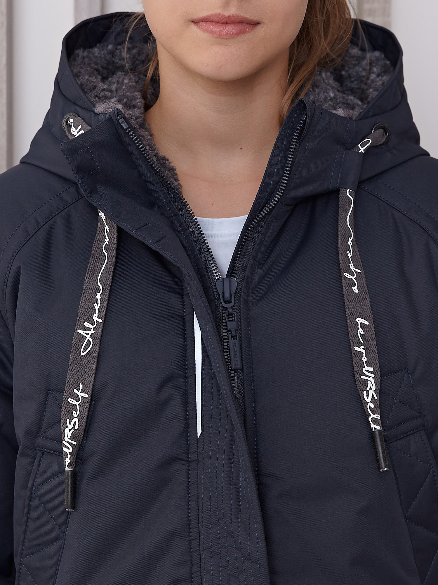 - По лицевой части капюшона проходит кулиса со шнуром и отлетная стёганая планка.