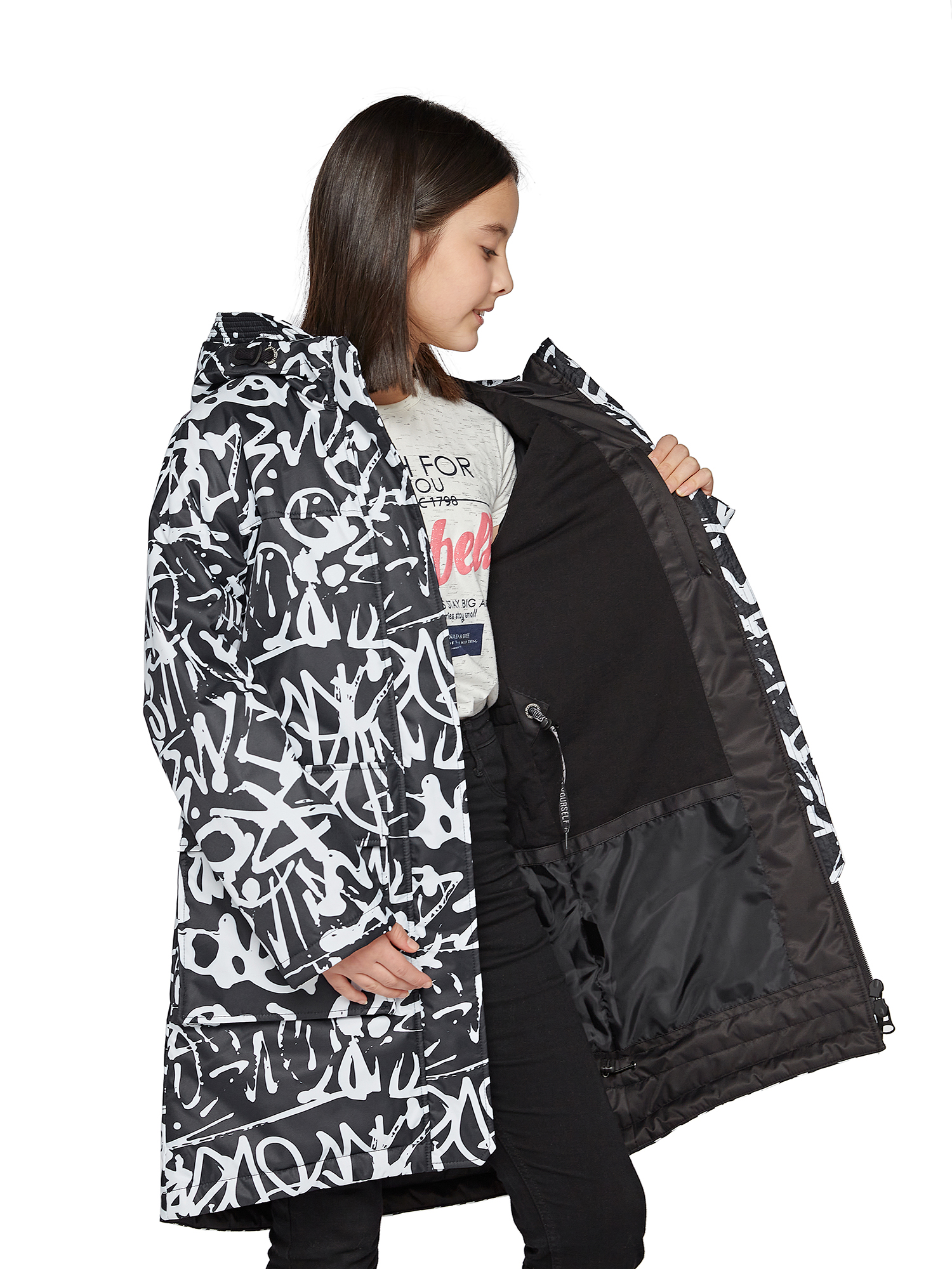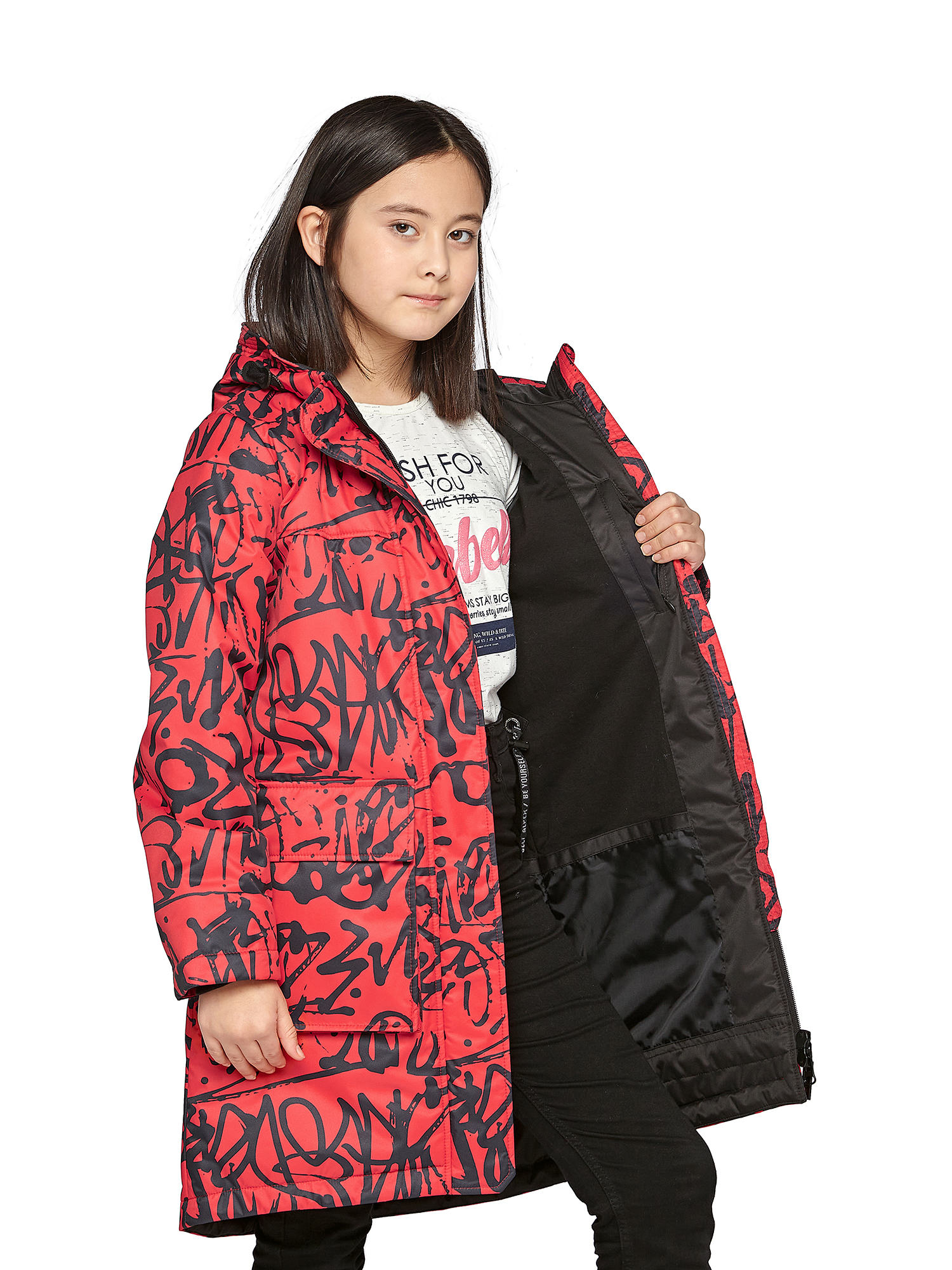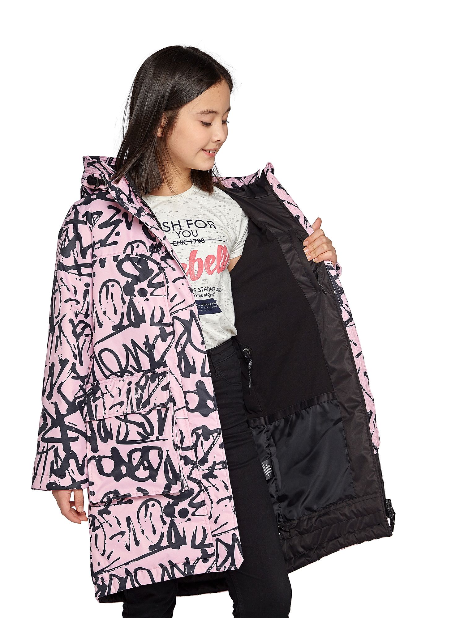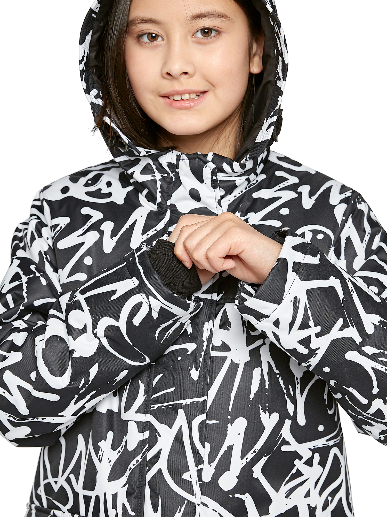 Утепленный капюшон не съемный.Внутренние утяжки с фиксаторами по талии и низу изделия.Внутренний манжет.