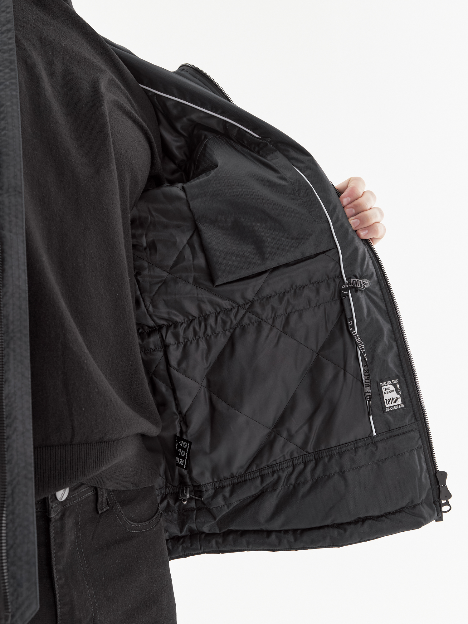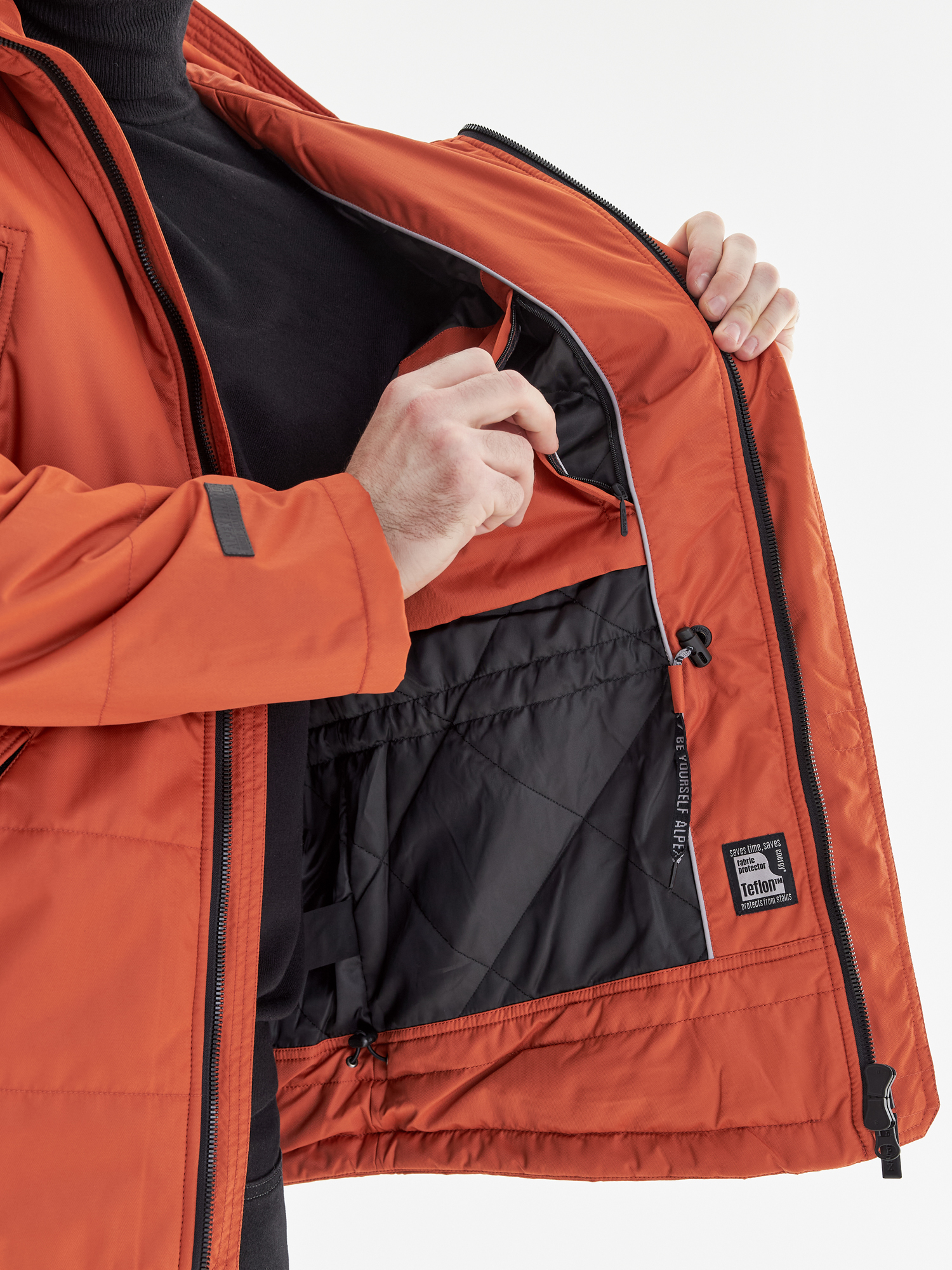 - Дополнительная защита: внутренняя кулиска с фиксаторами по низу куртки блокирует порывы ветра.
