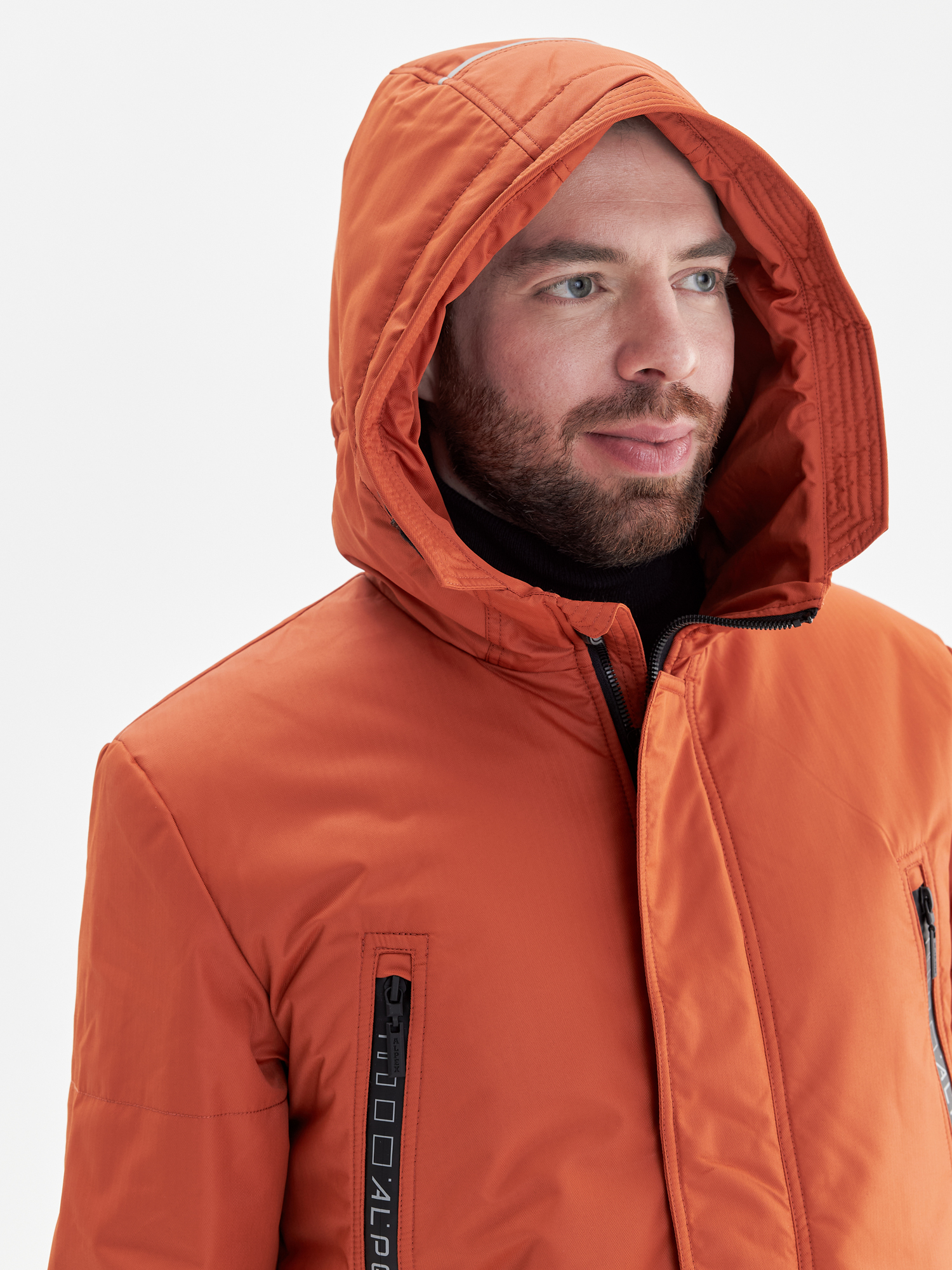 - Капюшон: несъёмный, объёмный, регулируемый утяжками по контуру.