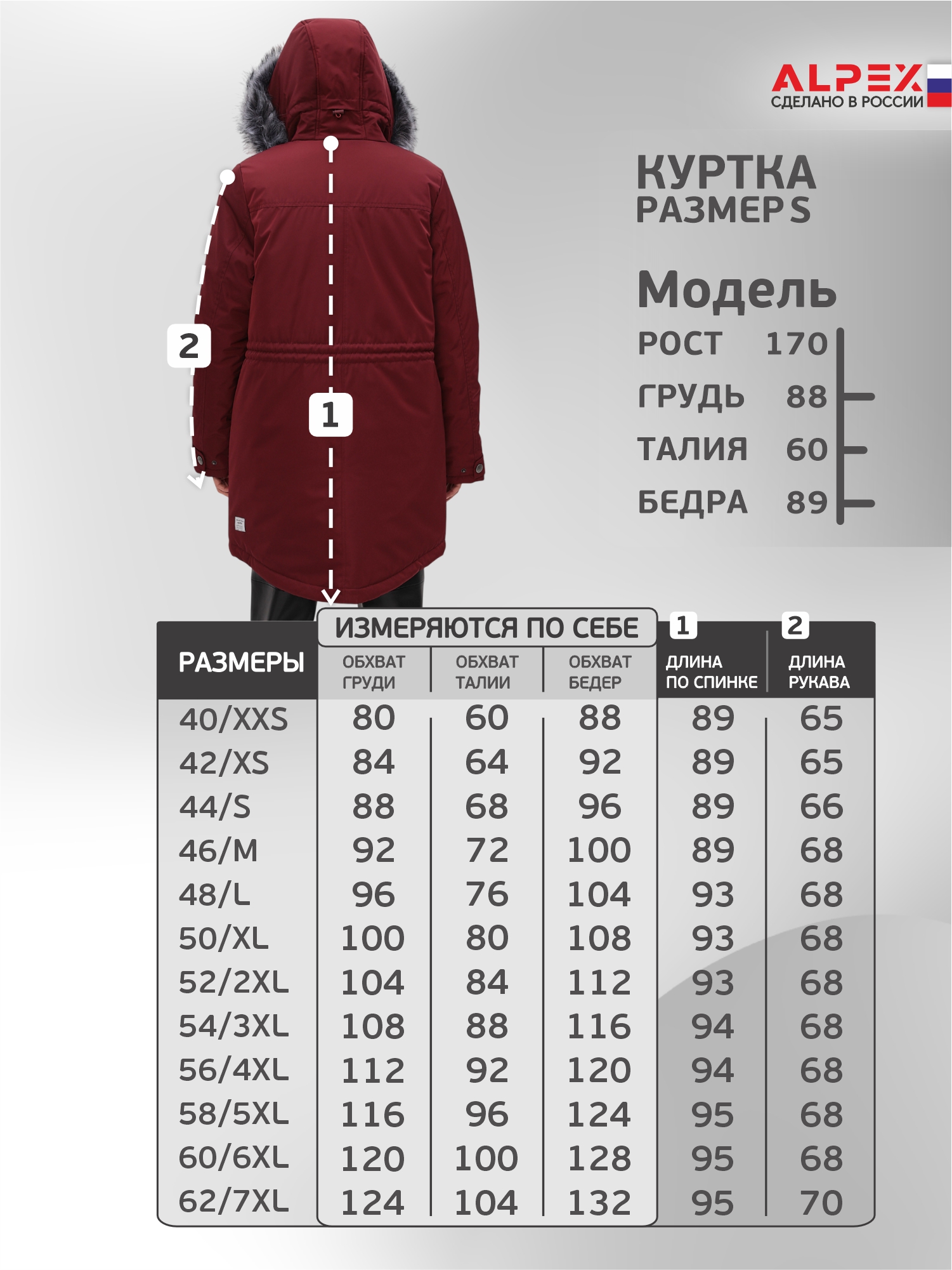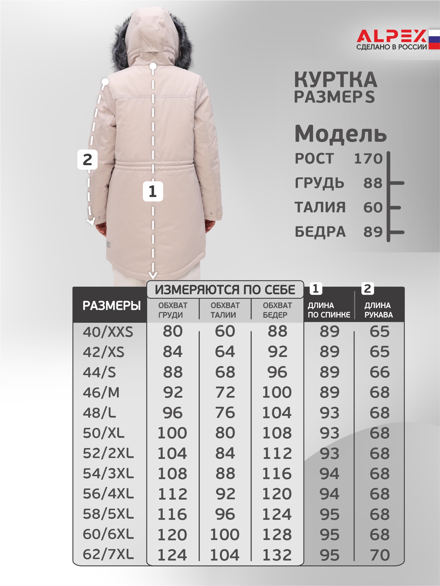 - Размеры: 2XS, XS, S, M, L, XL, 2XL, 3XL, 4XL, 5XL, 6XL, 7XL — есть модели для высоких и plus-size.