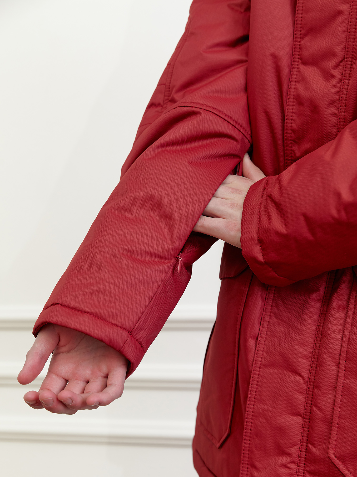 - на подкладке левой полочки прорезной карман с листочкой на молнии;